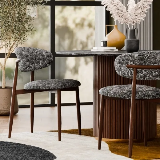 The harmonious blend of Nordic and Mid-Century in the Lucien Dining Chair makes it an irresistible option for kitchen and dining spaces. The curved metal frame has a walnut metal finish and is cross-fixed, making the Lucien durable and long-lasting for a high quality finish built to last.