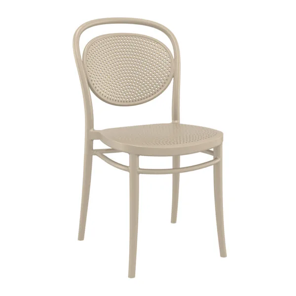 Marcel stacking chair is produced with a single injection of polypropylene reinforced with glass fiber obtained by means of the latest generation of air moulding technology with neutral tones. For indoor and outdoor use.