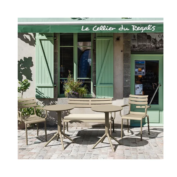 Sky folding table is made of durable weather-resistant resin. Metallic frame will never unravel, rust or decay. It is UV protected which insures the colors will not fade. Can be disassembled. For indoor and outdoor use.